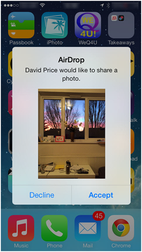 5. The nearby iPhone/iPad will receive a pop-up photo to preview, just tap “accept” and get the photo saved in your iPhone;